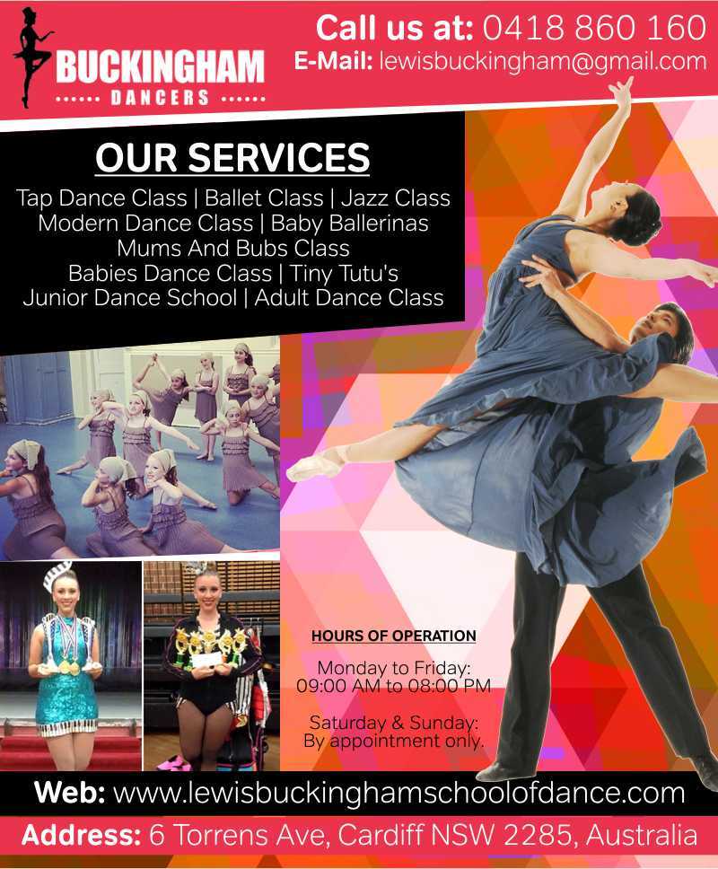 Lewis Buckingham School of Dance is located in Lake Macquarie and Newcastle and is highly popular for presenting dance classes for various kinds. We were established with a motive to provide solution under a single roof so that you do not have to wander around to fulfill your dancing desire. You are welcome to join our dance school for learning the art. You can enroll for jazz class, modern dance class, mums and bubs class and much more. Visit our official website for hiring our assistance! Contact : Carly Tyrrell E-Mail : [email protected] Phone: 0418 860 160 Address: 6 Torrens Ave, Cardiff NSW 2285 Method of Payments: Visa/Master, Cash, Bank Transfer, EFT. Hours of operation: Monday to Friday : 09:00 AM to 08:00 PM. Saturday & Sunday : By appointment only. https://www.facebook.com/lewisbuckingham.dance/ Website: https://www.lewisbuckinghamschoolofdance.com