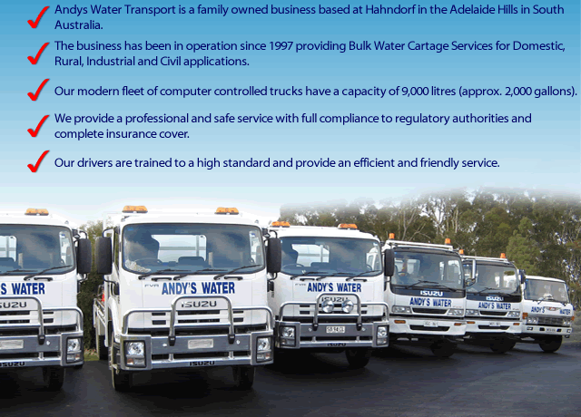Andys Water Transport provide Bulk Water Cartage to Adelaide, the Adelaide Hills and within 200km of Adelaide for Domestic, Rural, Civil and Industrial applications with same day delivery, 7 days.Andys Water Transport also trade as Hills Water Cartage in the Adelaide Hills area.Andys Water Transport have modern computer controlled trucks with professional drivers, ensure full compliance with regulatory authorities and have complete insurance cover.Andys Water Transport have been proving Bulk Water Cartage since 1997.