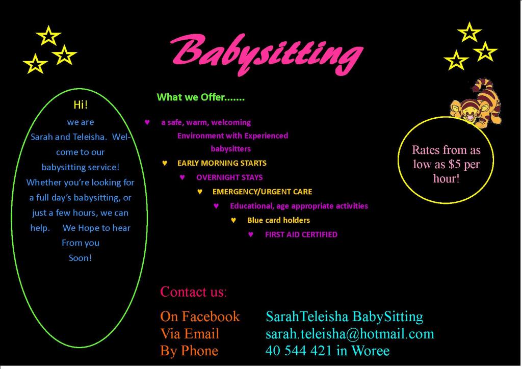 Teleisha and Sarah are aged 20 and 23, whom are starting up a Family Day Care center in Woree, They are offering Baby Sitting services to put Earn some money to put towards there Family Day care Center. Sarah and Teleisha have heaps of experince with children and are avail 24/7. They work from home, They do, Emergency Care, Full time, part time, or just a couple of hours. We are a young couple who are seeking the opportunity in starting our own business, to gain our goal in life.