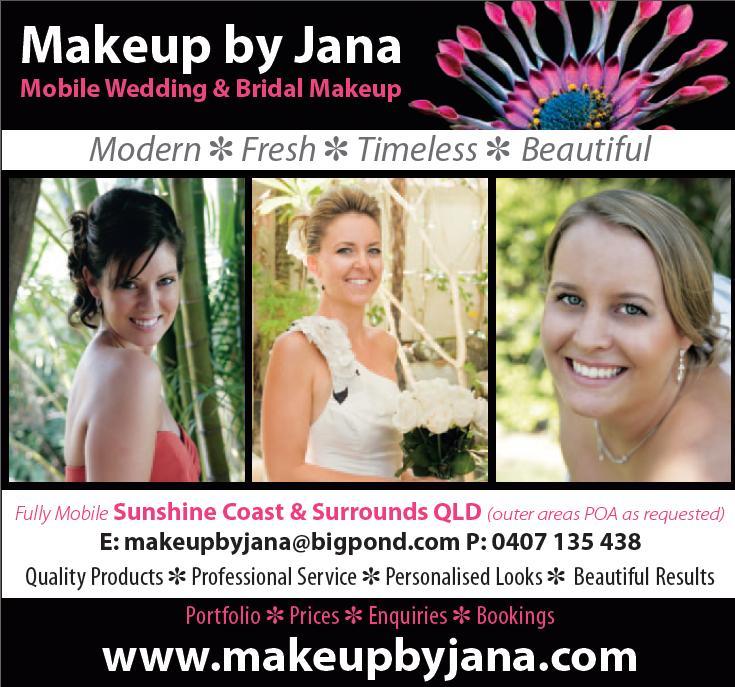 Makeup By Jana is a fully mobile Sunshine Coast & Noosa Wedding Makeup service. Trials are FREE from Noosa to Kawana. Best done same day as hair trial wherever possible. Taking around 1- 1.5hrs. This includes Sunshine Coast travel. Before & After shots. Skincare recommendations, pre-wedding acne prevention and treatment, "Tinkering" is included where I can see if you would like more or less, any concerns, comfort level, so we can perfect the look for you. Foundation colour matching is done and I write down all the colours and products used, i.e. foundation, powder, eyeshadows, blush shade, lip liner, lip colour, lip shine colours, false lash lengths etc... So the look is matched on your wedding day. The foundation colours will be altered on the wedding day if you have a fake tan to match your skin tone. If your bridesmaids would like a trial also they can have theirs done separately or on the same day. If you are happy without a trial I will just allocate a little extra time on your wedding day, to do the colour matching and have a mini consult with you there. Makeup By Jana uses professional quality products from M.A.C, Napoleon, The Body Shop, Youngblood, Laura Mercier, Benefit and some other wedding specialised products. Professional products, tools and application skills are used to create a bridal look, which is long lasting, suitable for photography (a lot of regular makeup brands are unsuitable for photography makeup), looks amazing up close, feels comfortable. Makeup By Jana is highly trained in Mineral Makeup application using Natures MineralsTM from The Body Shop & Youngblood Finishing Powders. This is for very sensitive skin or contact lens wearers, those requesting a natural but flawless finish, and for those not used to wearing makeup as you can barely feel it on. Usually mature skin makeup is required here, being a Makeup By Jana speciality. Mineral or liquid foundation is used depending on skin type and coverage preferences. You can be assured the makeup will be suitable for the more mature look and bring out the very best features and have the mother or relative feeling a million dollars on her daughter's special day. Family shots coming up? Maternity shots? Couple Shots? you want to look amazing in these photos you are paying so much for. Photography makeup is a very specialised skill to get the most out of your shots you must use the right products. Portraiture makeup is affordable and quick it only takes 45mins - 1hr.