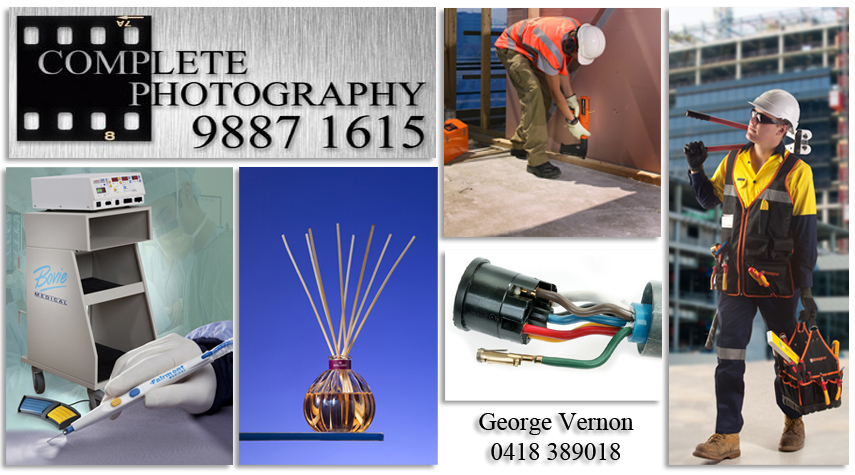 25 years experience in commercial and industrial photography and broadcast television.Video and video edit in-house. Video for websites or DVD distribution.Large drive-in studio located near Knox City shopping centre.Free no obligation estimates for your next shoot.Product photography for advertising, brochures, catalogues and websites.Photoshop retouching in-house. Location photography. Portable studio flash equipment enables studio lighting to be set-up on location. Products may then be photographed in your office or warehouse.HD Video shoot, script, edit, all in-house. Get the Complete picture.www.completephotography.com.au